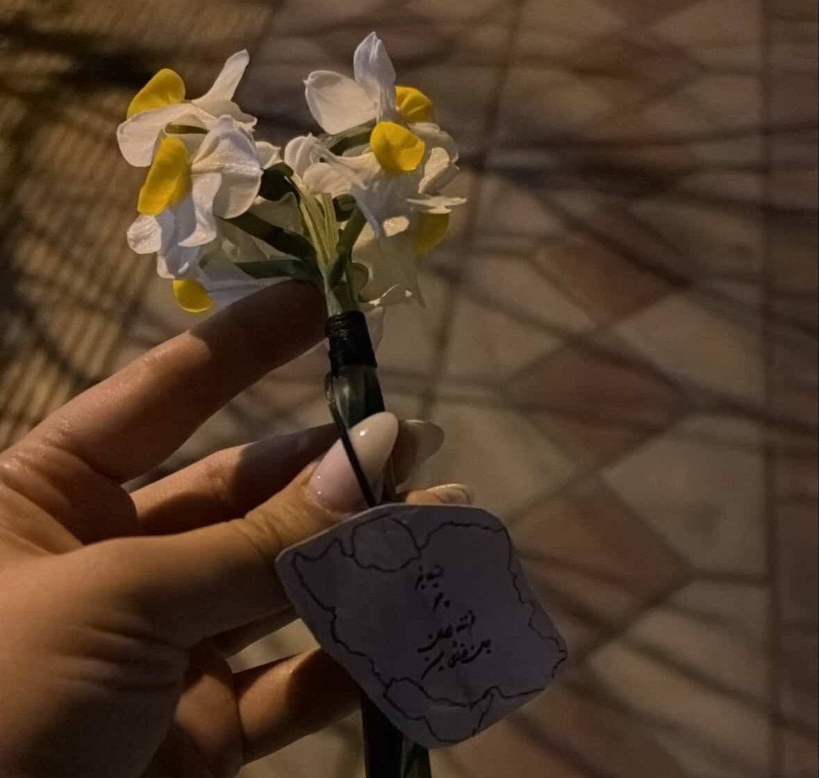 این گل را در خیابان دولت تهران مردم به یکدیگر میداند؛ روی آن نوشته شده: