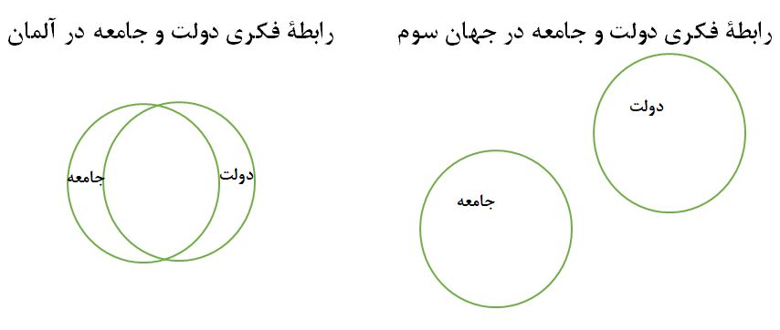 در جهان سوم رابطۀ میان دولت و جامعه دوطرفه نیست؛ دو دایرۀ غیر متداخل است. هر کدام کار خودشان را میکنند. آنهایی که در جامعه به دنبال پول و مقام و شهرت هستند، حال واقعی یا مصنوعی، از فضاهای دولتی برای اهداف خود بهره برداری میکنند. میان دولت و جامعه، قرارداد اجتماعی که بهم وصل شوند و روابط متقابل و اثرگذاریهای متقابل وجود داشته باشد بسیار محدود است. فِلش از دولت به جامعه است. در مقابل در آلمان، یورگن هابرماس ظهور میکند و اندیشههای خود را در راهروهای قدرت میبرد و بر محاسبات و معادلات دولتیها اثر میگذارد چون میان هابرماس (جامعه) و آنگلا مرکل (دولت)، پدیدهای به نام آلمان، اعتبار آلمان، کارآمدی آلمان، ثروت آلمان، آیندۀ آلمان و فلسفۀ زندگی آلمانی وجود دارد. حلقۀ وصلی میان جامعه و دولت وجود دارد. در جهان سوم، دولت و جامعه یکدیگر را رها میکنند و هریک به فکر خویش است و سَرِ فرصت از هم استفاده میکنند. در نظر داشته باشیم در سال ۱۷۶۲ (۲۵۷ سال پیش) ژان ژاک روسو در رسالهای مفصل، «قرارداد اجتماعی» را نوشت تا راهروهایی بین دولت و جامعه ایجاد کند. همینطور توجه داشته باشیم که خروج انگلستان از اتحادیه اروپا با این تقسیم بندی بسیار نزدیک ۵۱.۹ درصد موافق و ۴۸.۱ درصد مخالف تحقق یافت.
