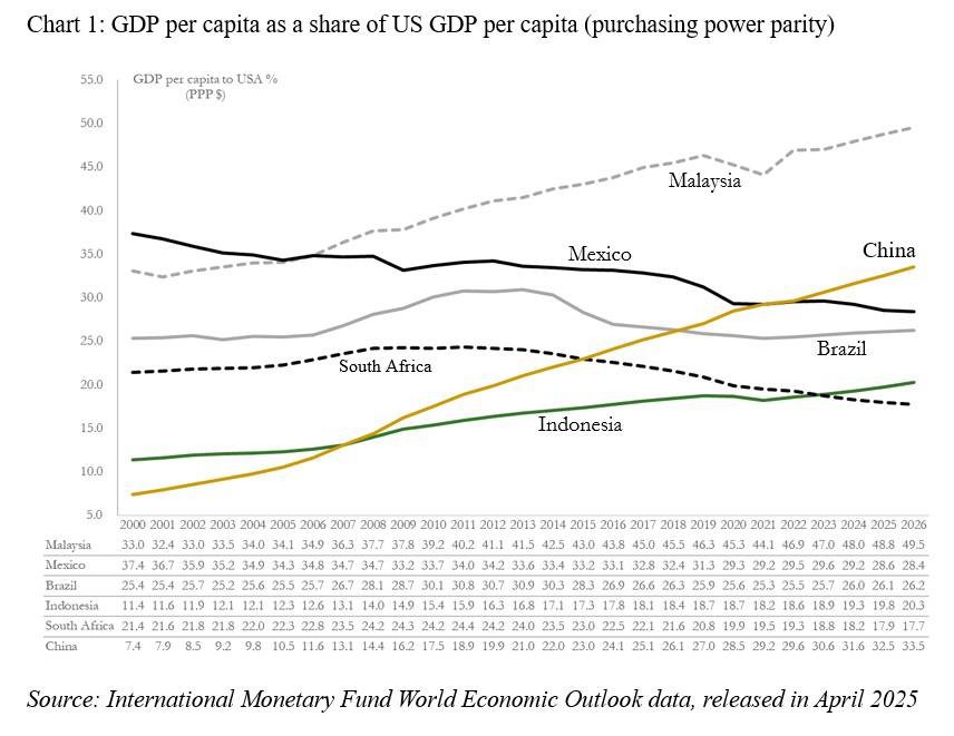 همانگونه که نمودار ۱ نشان میدهد، مسیر چین با کشورهایی چون برزیل و مکزیک متفاوت است، کشورهایی که زیر آستانهٔ ۴۰ درصد باقی ماندهاند و حتی در سالهای اخیر کاهش نسبی تولید ناخالص داخلی سرانه نسبت به آمریکا را تجربه کردهاند.