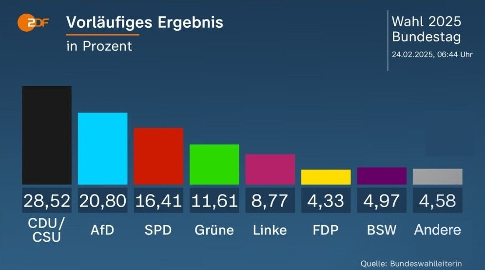 بر اساس پیشبینیها، حزب AfD با کسب جایگاه دوم، تقریباً نتیجه خود در انتخابات سال ۲۰۲۱ را دو برابر کرده است. این حزب به بزرگترین نیروی مخالف در پارلمان تبدیل خواهد شد، چراکه تمام احزاب اصلی اعلام کردهاند که حاضر به ائتلاف با آن نیستند.