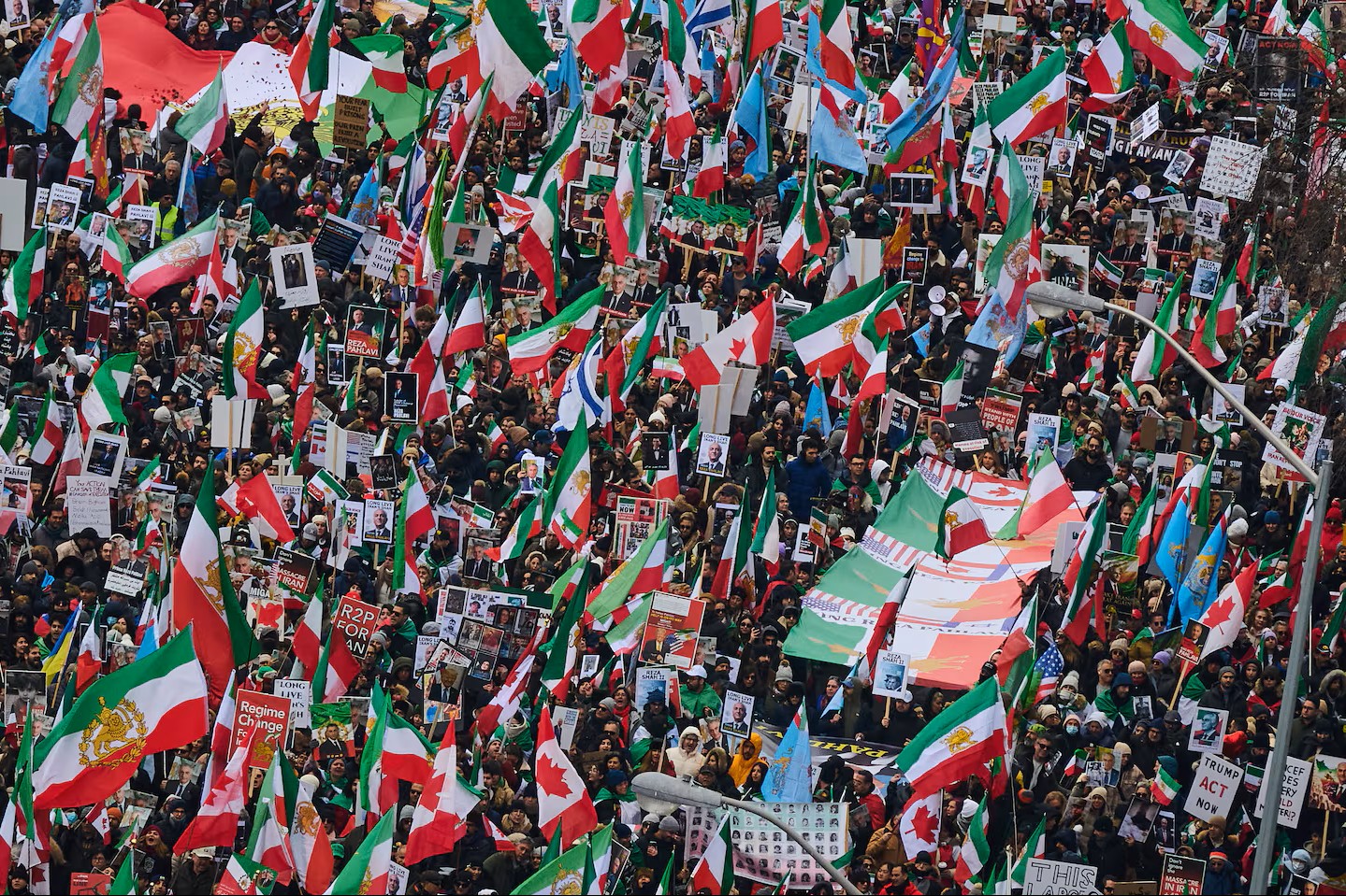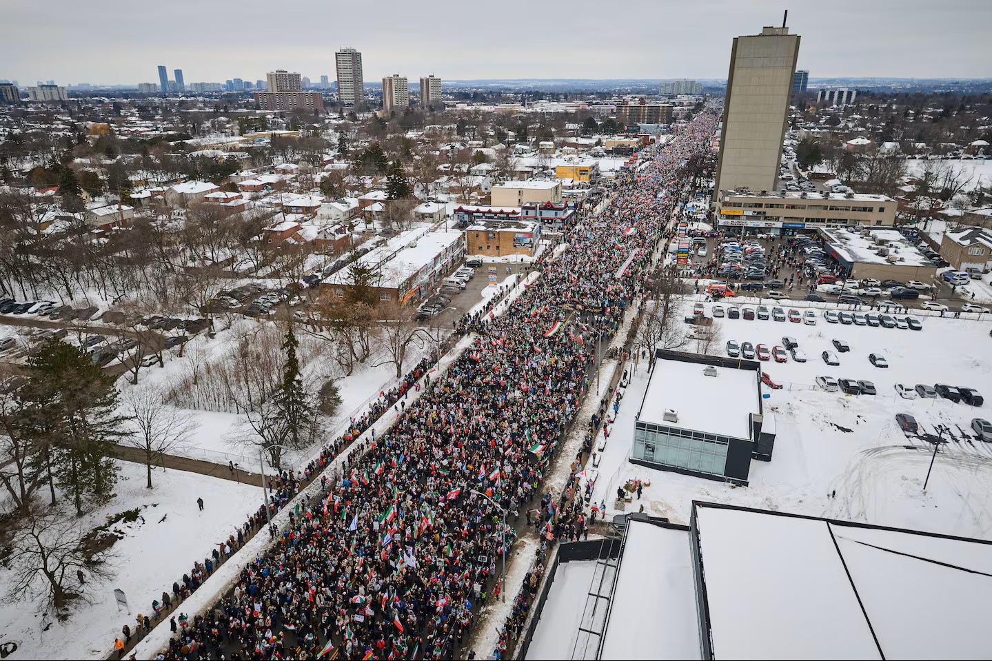 سیل عظیم شرکتکنندگان در تظاهرات تورنتو روز شنبه ۱۴ فوریه در دمای صفر درجه به خیابان آمدند و در حمایت از معترضان در ایران و رضا پهلوی، فرزند آخرین شاه ایران شعار سر دادند.