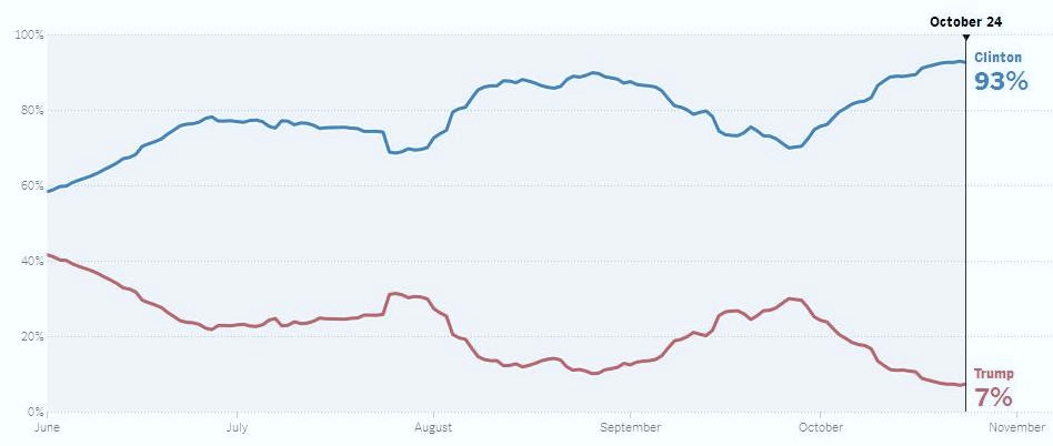 براساس بررسیهای نیویورک تایمز، کلینتون از شانسی ۹۳ درصدی برای پیروزی در انتخابات برخوردار است و شانس ترامپ تنها ۷ درصد است. نمودار زیر هم شانس پیروزی دو کاندیدا در انتخابات را از ماه ژوئن تاکنون نشان میدهد.