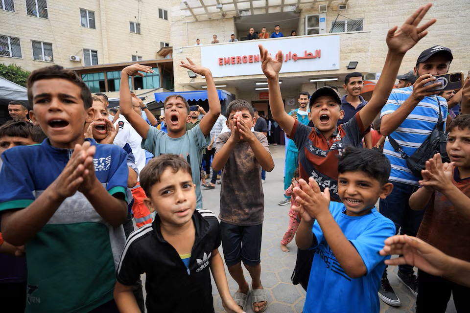 در غزه، جایی که بیشتر بیش از ۲ میلیون نفر در اثر بمباران اسرائیل آواره شدهاند، مردان جوان در خیابانهای ویران شده دست زدند، حتی با وجود ادامه حملات اسرائیل.