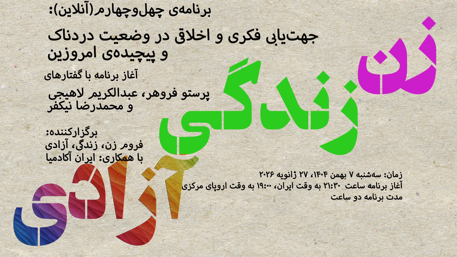 زمان: سهشنبه ۷ بهمن ۱۴۰۴، ۲۷ ژانویه ٢٠٢۶، آغاز برنامه ساعت ۲۱:۳۰ به وقت ایران، ١۹:۰۰ به وقت اروپای مرکزی