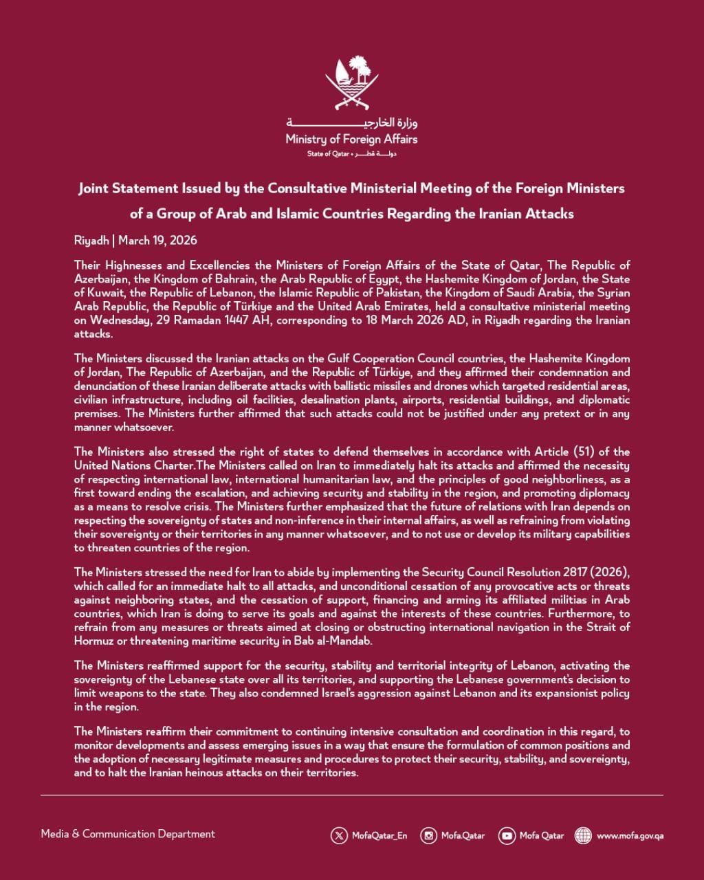 وزرای امور خارجه ترکیه، جمهوری آذربایجان، پاکستان، امارات متحده عربی، قطر، بحرین، مصر، اردن، کویت، لبنان، عربستان و سوریه روز چهارشنبه در ریاض نشستی مشورتی در سطح وزارتی درباره حملات ایران برگزار کردند.