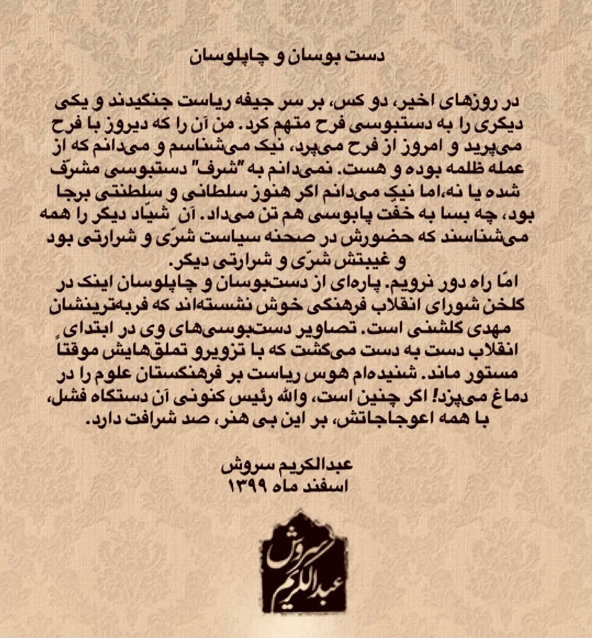 امّا راه دور نرویم. پارهای از دستبوسان و چاپلوسان اینک در گلخن شورای انقلاب فرهنگی خوش نشستهاند که فربهترینشان مهدی گلشنی است. تصاویر دستبوسیهای وی در ابتدای انقلاب دست به دست میگشت که با تزویرو تملقهایش موقتاً مستور ماند. شنیدهام هوس ریاست بر فرهنگستان علوم را در دماغ میپزد! اگر چنین است، والله رئیس کنونی آن دستگاه فشل، با همه اعوجاجاتش، بر این بیهنر، صد شرافت دارد.