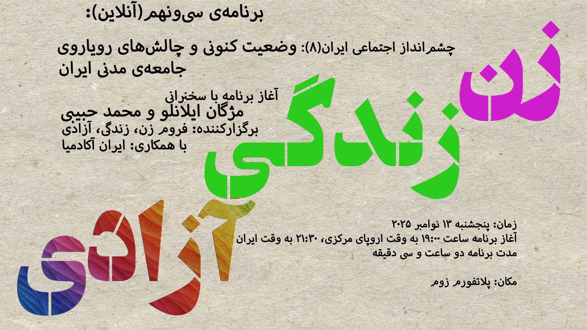 پنجشنبه ۱۳ نوامبر ٢٠٢۵ در برنامهای با موضوع «چشمانداز اجتماعی ایران(۸): وضعیتِ کنونی و چالشهای رویاروی جامعهی مدنیِ ایران»