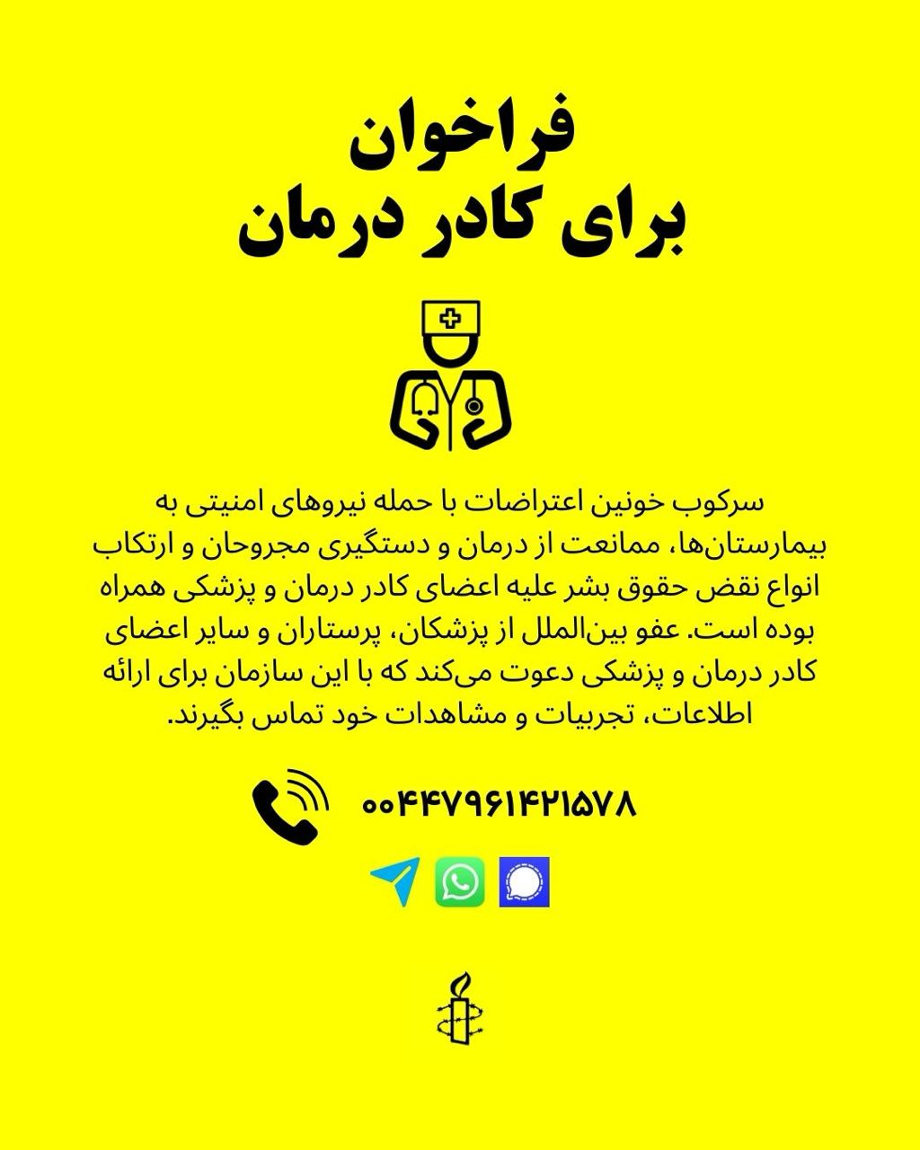 سرکوب خونین اعتراضات با حمله نیروهای امنیتی به بیمارستانها، ممانعت از درمان و دستگیری مجروحان و ارتکاب انواع نقض حقوق بشر علیه اعضای کادر درمان و پزشکی همراه بوده است. عفو بینالملل از پزشکان، پرستاران و سایر اعضای کادر درمان و پزشکی دعوت میکند که با این سازمان برای ارائه اطلاعات، تجربیات و مشاهدات خود تماس بگیرند.