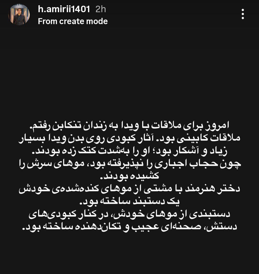 حمیدرضا امیری، همسر ویدا ربانی، از دیدار با او خبر داد و نوشت: آثار کبودی روی بدن ویدا بسیار زیاد و آشکار بود و او را به شدت کتک زده بودند چون حجاب اجباری را نپذیرفته بود و موهای سرش را کشیده بودند.