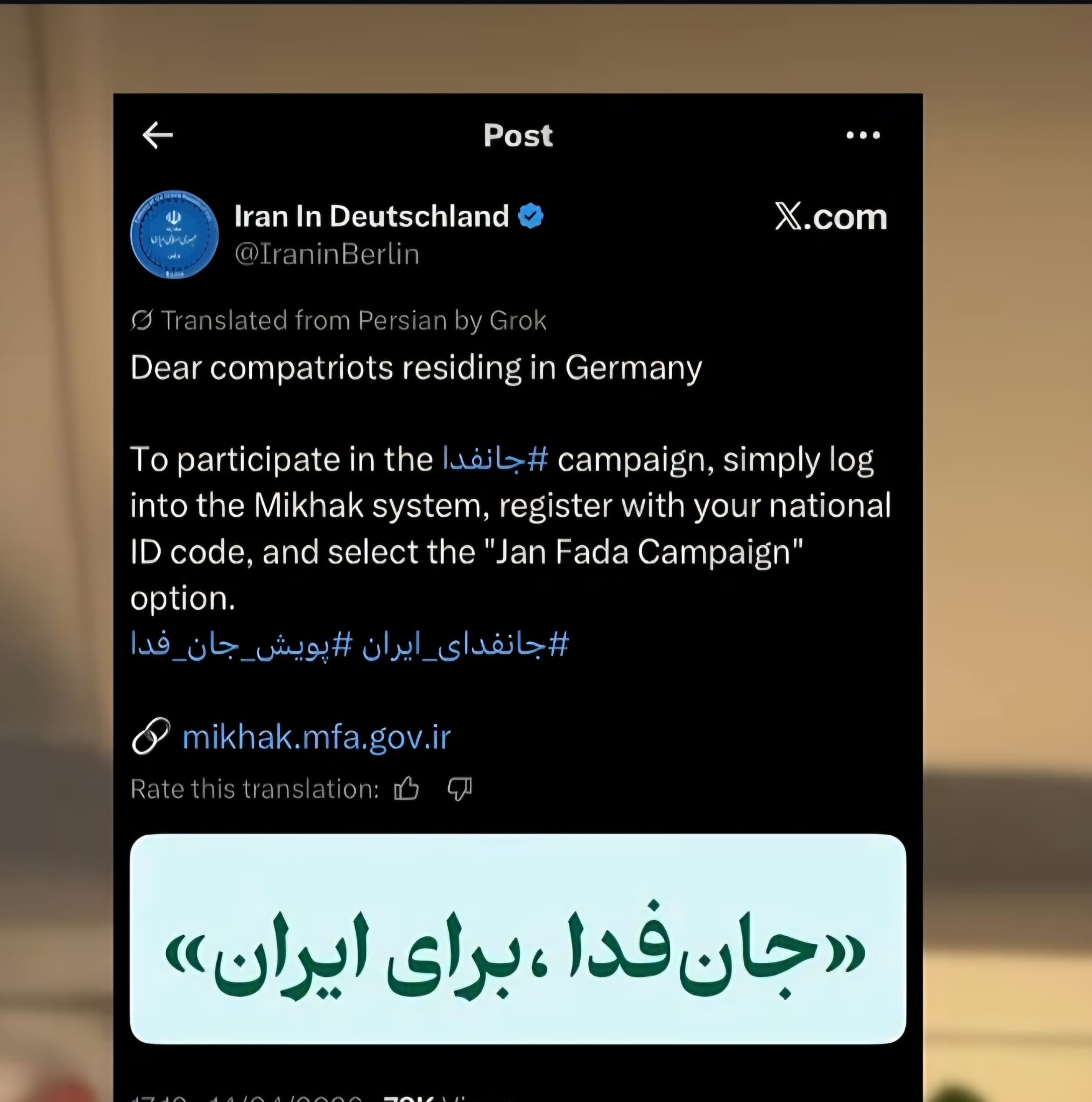 ما با نگرانی عمیق و با انتظارِ یک واکنش روشن، قاطع و مبتنی بر حاکمیت قانون، این نامه را در پی فراخوانهای علنی منتشرشده از سوی سفارت جمهوری اسلامی ایران در برلین در حمایت از کارزار موسوم به «جانفدا» به حضورتان تقدیم میکنیم. همزمان، بنا بر مستندات منتشرشده از سوی نهادهای معتبر بینالمللی حقوق بشری، در داخل ایران و در ارتباط با همین بسیج و سازماندهی، کودکان از ۱۲ سالگی مورد خطاب قرار گرفته و برای مشارکت جذب میشوند. سازمانهای دیدهبان حقوق بشر و عفو بینالملل در ماههای مارس و آوریل ۲۰۲۶ صراحتاً نسبت به این موضوع هشدار دادهاند.
