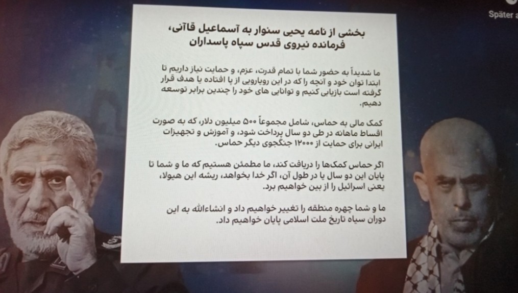 دستخطی که بعد از ترور سنوار از مخفیگاه وی پیدا شد، نشان میدهد که او برای سازماندهی و اجرای این طرح، از قاآنی تقاضای ۵۰۰ میلیون دلار کرده بود.
