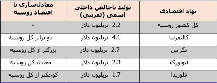 دقت در سخنان فوق ما را با اهمیت ضعف مزمن و تاریخی دولتهای حاکم بر روسیه (و ایران) در زمینه نوآوری در علم و تکنولوژی آشنا میکند. بخصوص این توالی تکاملی میان سه منبع (خشونت، ثروت، و دانش) نبود جذابیت روسیه برای همسایگان بمراتب ضعیفتر خودش را بعنوان معضلی برای روسیه مطرح میکند. روسیه مجبور است کسری خود در رقابت با دانش و تکنولوژی غربی را قسما از طریق فروش مواد خام جبران کند. در جدول شماره ۲ کل اقتصاد روسیه با اقتصال ۴ ایالت آمریکا مقایسه شده است کی میبینم کوچکتر از اقتصاد سه ایالت است و از میان آنها اقتصاد کالیفرنیا دوبرابر اقتصاد روسیه است.