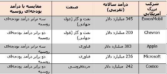 در جدول شماره ۳، درآمد بودجهای دولت روسیه با درآمد ۵ شرکت بزرگ آمریکایی مقایسه شده است. به این فکت میتوان افزود که ۴ کشور اروپایی شامل آلمان، بریتانیا، فرانسه و ایتالیا هم، هرکدام اقتصادهایی بزرگتر از اقتصاد روسیه دارند.