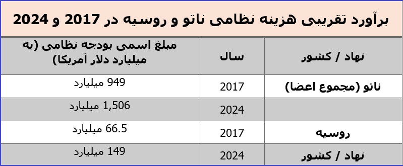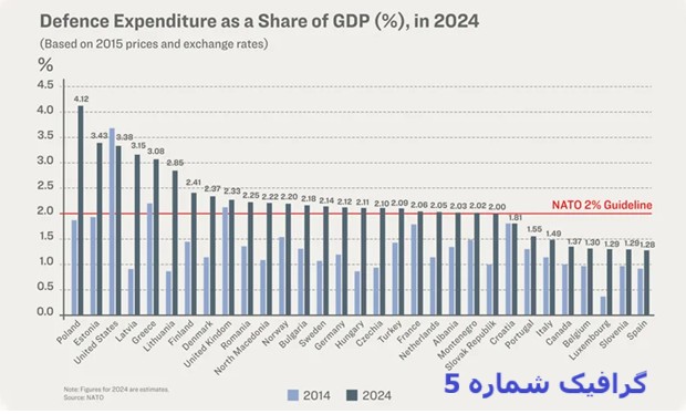 اروپا شامل کشورهای اروپایی خارج از اتجادیه اروپا، جمعیتی حول ۵۳۰ میلیون نفر است که صاحب یک تولید ناخالص ملی به ارزش ۲۵ تریلیون دلار و یکی از این کشورها یعنی فرانسه دارای سلاح اتمی نیز هست. با این وجود، این جبهه اروپایی در مقابل روسیه، دارای ۱۴۵ میلیون جمعیت و اقتصادی یازده بار کوچکتر از اروپا و ۲۵ بار کوچکتر از مجموع اقتصاد کشورهای پیمان ناتو است، نه توان بازدارندگی داشته است و نه الان در چهارمین سال از جنگ تجاوزکارانه روسیه به اوکراین، توان دفع تجاوز روسیه از اراضی اوکراین را دارد. جالب است که دونالد ترامپ با همه عیوب خود، در دور اول ریاست جمهوریاش همه تلاش خود را بکار بست تا طرف اروپایی پیمان ناتو را به افزایش بودجه نظامی به ۵ درصد از تولید ناخالص ملی مجبور کند. این رقم تا آن زمان بطور اسمی ۲ درصد بود که آنهم در عمل (طبق دادههای نمایش داده شده در گرافیک شماره ۵) تنها از سوی سه عضو ناتو عملی شده بود. گرافیک شماره ۵ میزان بودجه دفاعی کشورهای عضو ناتو را نشان میدهد.