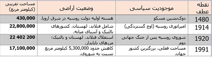 برای مقایسه، نمونه امپراتوری بریتانیا میتواند کمک کننده باشد. اشاره شد که، بریتانیاییها پیش از شروع اشغالگری در ماواری بحار، صاحب یک تجربه ۵ قرنی از دولتداری در متروپول یعنی کل جزیره بریتانیای کبیر (انگلستان، اسکاتلند، ولز) و ایرلند شمالی (پس از ۱۹۲۲) بودند. یعنی یک فاصله زمانی بزرگ میان تأسیس دولت ملت خودی با شروع دوران اشغال اراضی دیگران و تبدیل آنها به مستعمره. از نظر مکانی نیز، مابین متروپل و مستعرات، فاصله دریایی قابل توجهی بود. مثلا فاصله تا جبلالطارق بعنوان “نزدیکترین” مستعمره ۱۷۰۰ کیلومتر بود. یا مثلا فاصله هوایی لندن با دهلینو و بمبی با پرواز تجاری بین ۸ تا ۱۰ ساعت است. هیچ کدام از این دو عامل زمان و مکان برای امپراطوری روسیه و دولتهای میراثدار آن مطرح نبوده است. گسترش متصرفات روسیه در جدول شماره ۱ قابل مشاهد است.