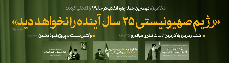 [۳] - مهمترین جمله رهبر انقلاب در سال ۹۴ انتخاب شد. پایگاه اطلاع رسانی خامنهای، ۲۷/۱۲/۱۳۹۴