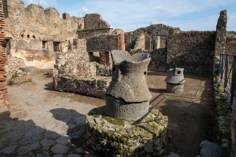 زوختریگل: این سنگهای آسیاب را میبینید؟ هر کدام را باید یک برده و یک الاغ ساعتها دور خود میچرخاندند تا این دستگاه سنگینِ چند تنی را با کمک یک تیر چوبی بچرخانند. از بالا دانهی گندم ریخته میشد و از پایین آرد بیرون میآمد. درست کنار آن، تنوری قرار داشت که نان در آن پخته میشد. در سال ۲۰۲۳، ما در همینجا اسکلت دو زن و یک کودک را یافتیم که هنگام فوران کوه وزوو، بر اثر فرو ریختن سقف، جان باخته بودند.
