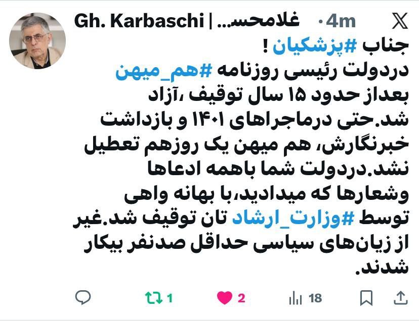 غلامحسین کرباسچی، مدیرمسئول روزنامه هممیهن در توئیتی خظاب به مسعود پزشکیان نوشت: در دولت ابراهیم رئیسی، روزنامه هممیهن از توقیف ۱۵ ساله خارج شد، اما در دولت شما به بهانههای واهی وزارت ارشادتان، هممیهن توقیف شد و ۱۰۰ نفر بیکار شدند.
