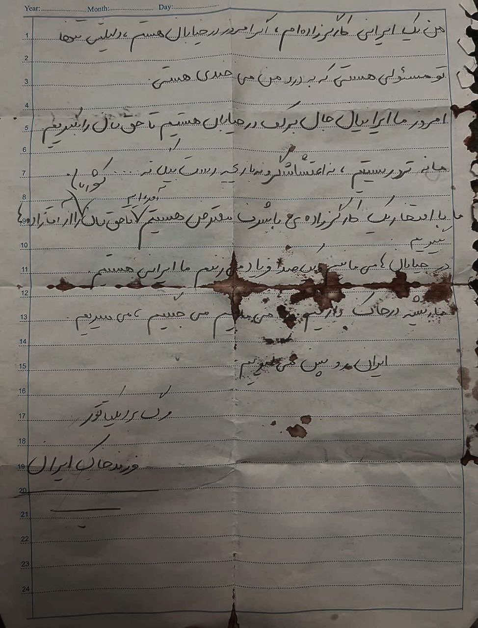 خدیجه علیپور ۱۸ دی در فردوس کرج کشته شد. او وصیتنامهاش را نوشته، در جیبش گذاشته و به خیابان رفته. برنگشته اما نوشتهاش را با خون خودش امضا کرده تا ما بخوانیم: